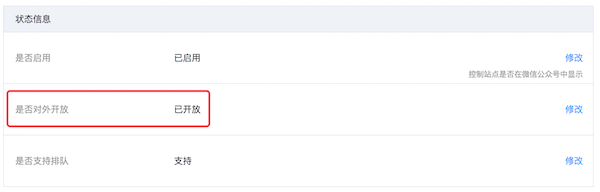 在「充电站管理」列表中点击充电站右侧的「站点详情」,进入站点详情页面,找到“状态信心”的设置部分。如下图所示,默认充电站的“是否对外开放”是“已开放”状态。此时充电站是场景1所处的模式中,任何用户扫码都可以充电,按照“收费标准”中设置的价格进行结算。
