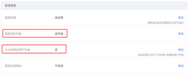 如果我们需要场景2,则将“是否对外开放”修改为“未开放”状态。如下图所示,修改后能看到一个新的开关“只允许特定用户充电”,这个开关默认是“否”的状态。注意,如果需要场景2,则不能将这个开关修改为“是”的状态。