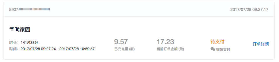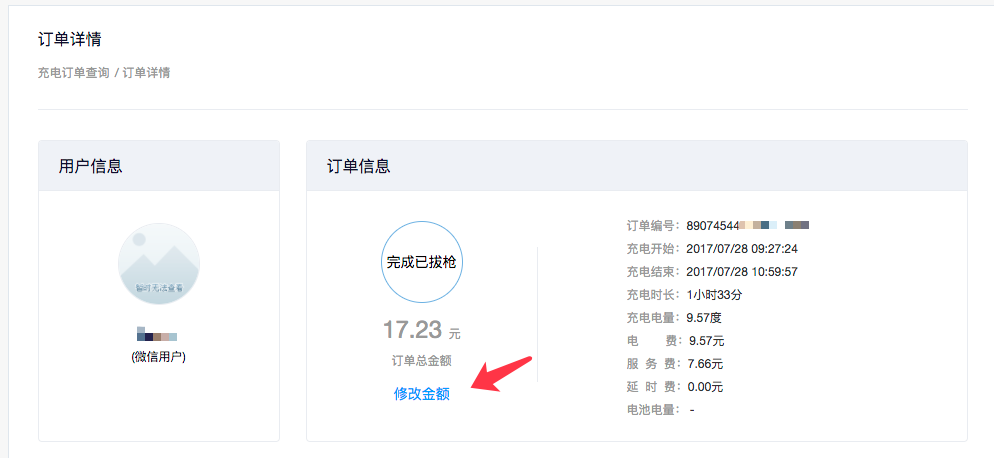 在「查询充电订单」页的订单列表中找到要修改金额的订单(记住必须是待支付状态,否则无法修改),点击「订单详情」进入详情页。