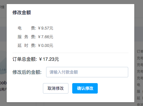 在“订单信息”部分金额下方有蓝色的「修改金额」按钮,点击按钮将弹出修改框。