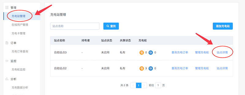 从「充电站管理」页面站点的「详情」进入充电站的站点信息页面。