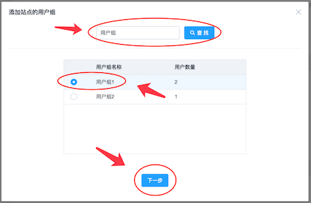 通过用户组昵称查找用户组,点击「下一步」。